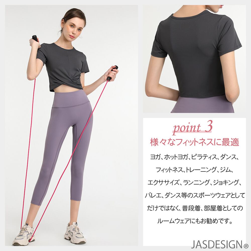 ヨガウェア トップス 半袖 レディース ショート丈 Tシャツ へそ出し クロスデザイン ピラティス フィットネス シャツ JM-208