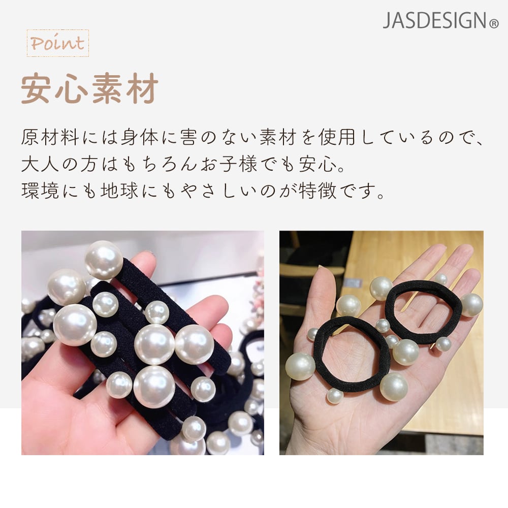 大小サイズの違うパールが付いた上品なデザインのヘアゴムです。
