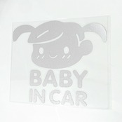 BABY IN CARの文字と女の子赤ちゃんのシルエットステッカーです。子供を車に乗せる方におすすめです。