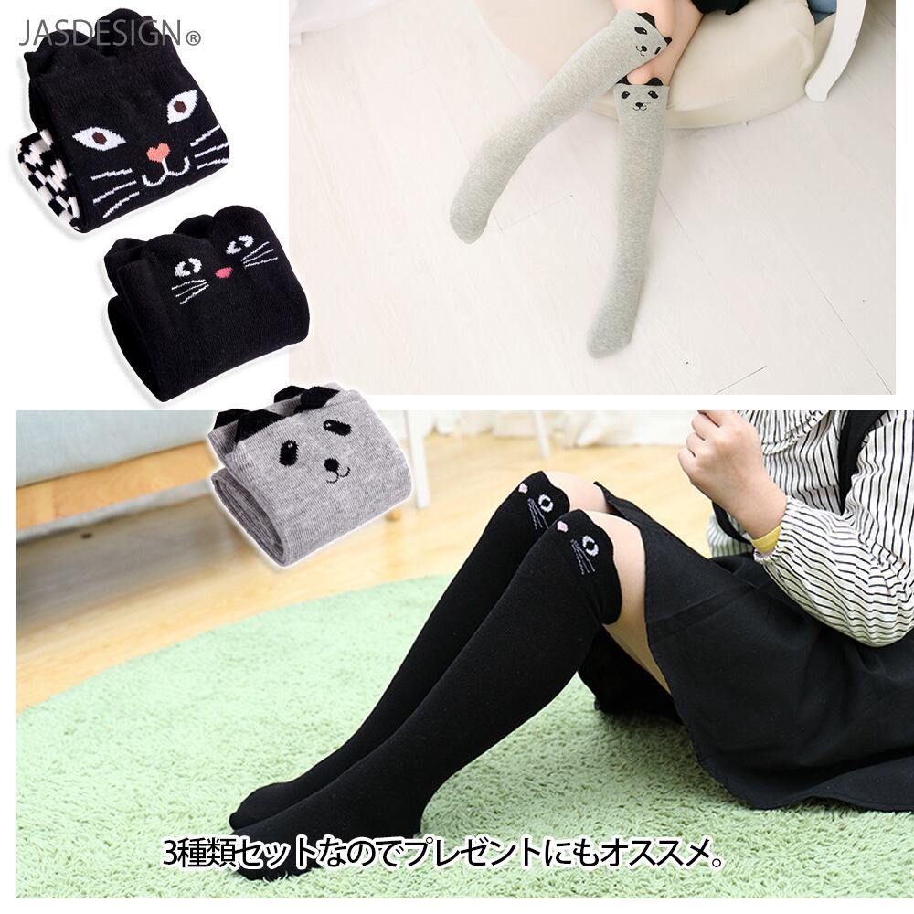 ハイソックス ニーハイソックス 子供 キッズ 靴下 3足組 女の子 アニマル 猫 ねこ ネコ 黒猫 黒ネコ クマ くま 動物 ボーダー 黒 可愛い ソックス ニーソックス フリーサイズ JM-368